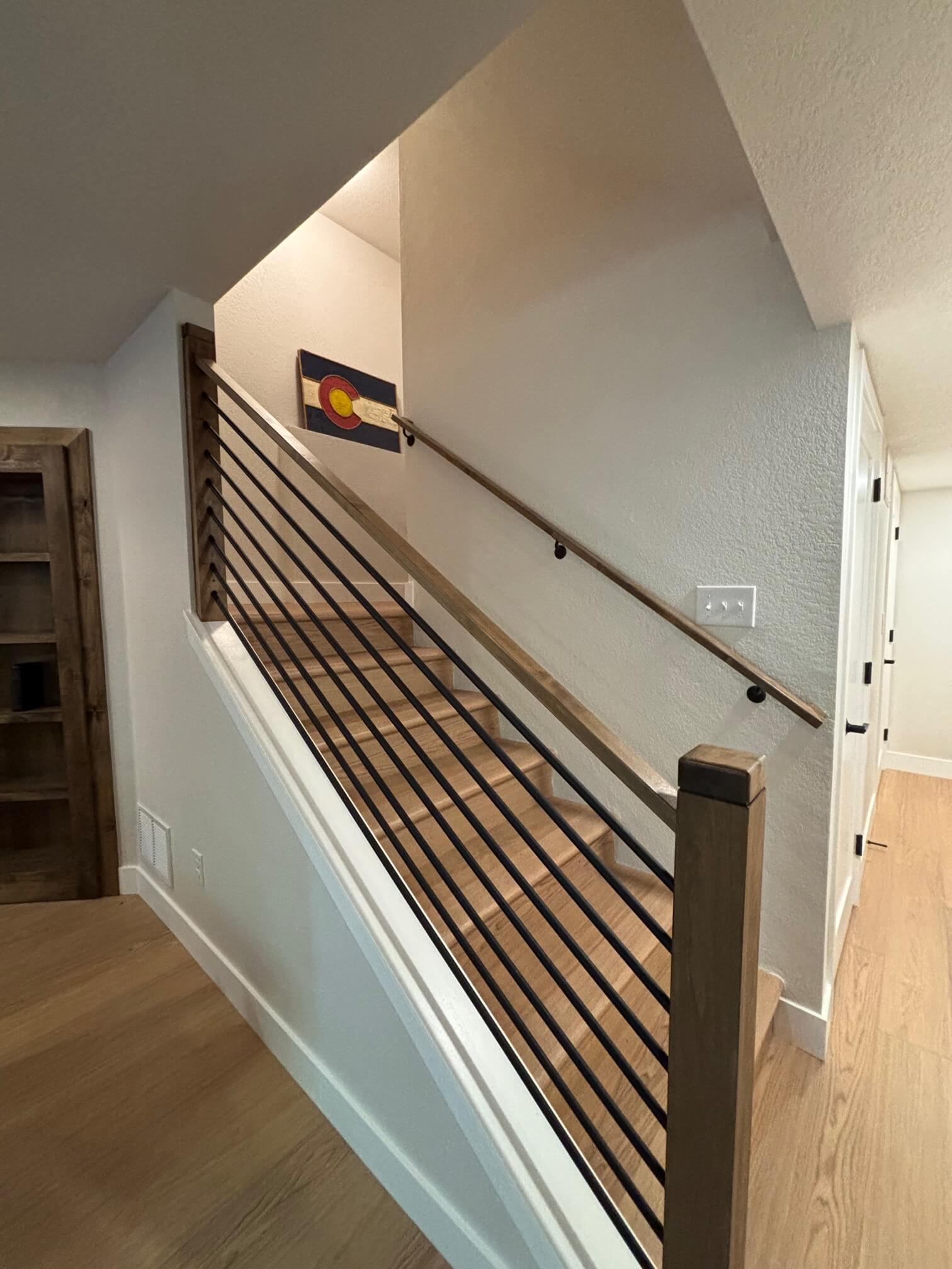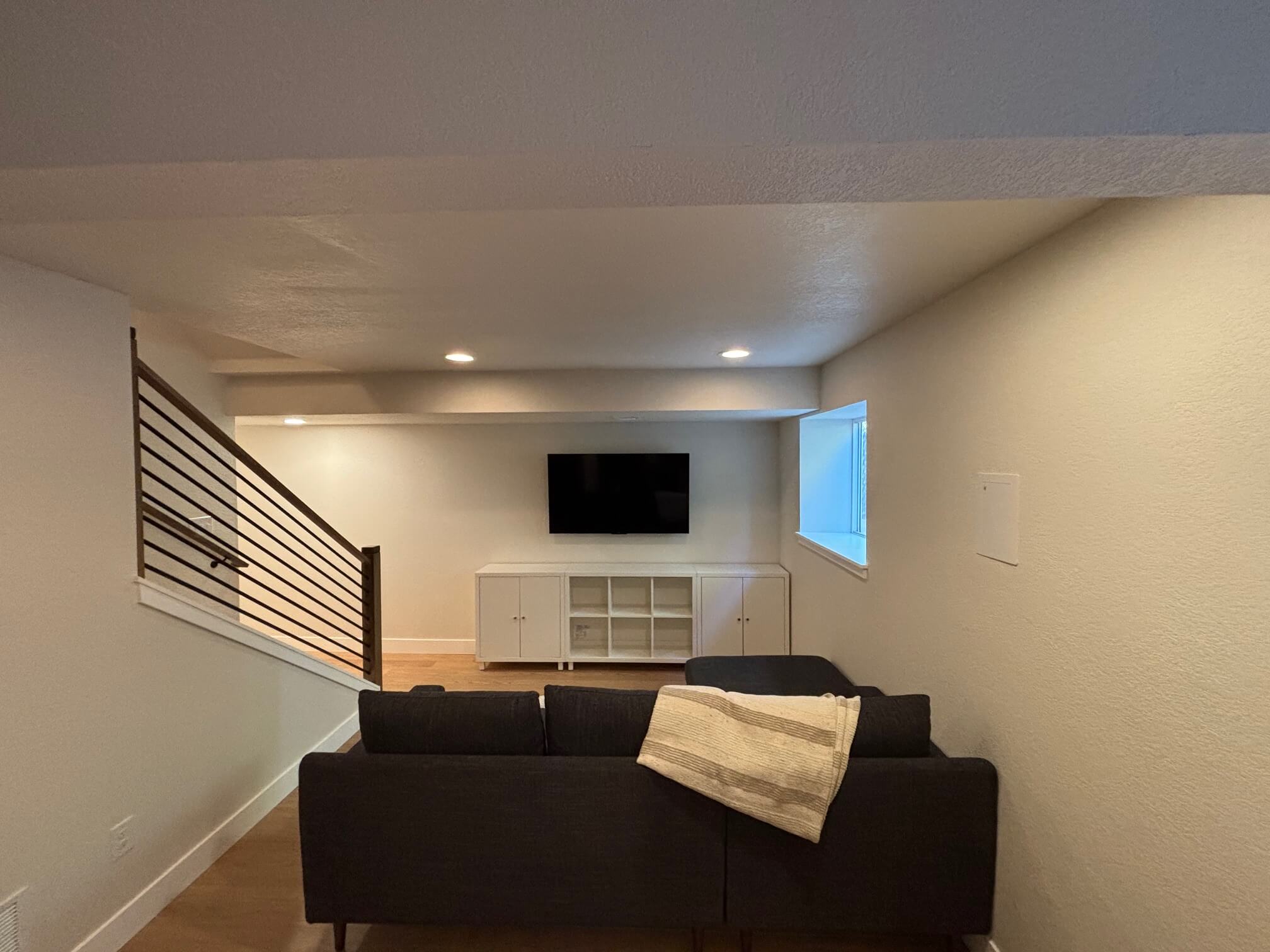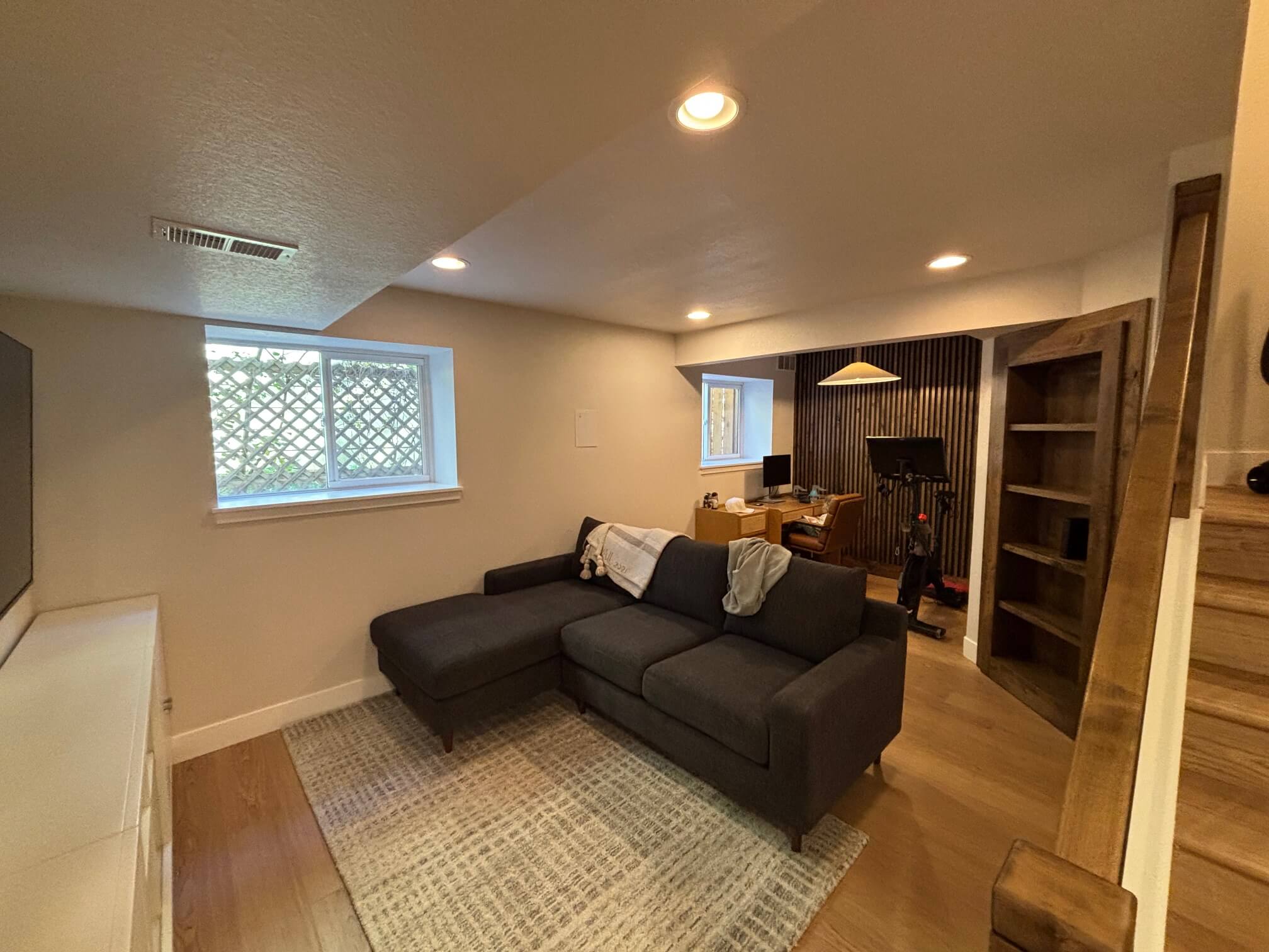 This Golden home underwent a full basement finish to create a versatile dual-use space. The main area was designed as a comfortable living room with a connected home office and exercise nook—complete with custom wood accents, built-in shelving, and modern metal railings for a clean, contemporary look.